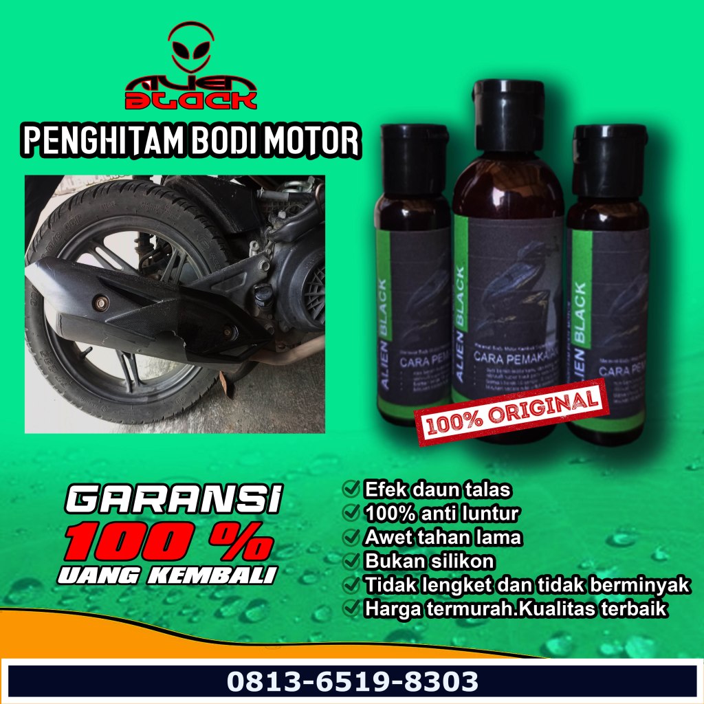 ALIEN BLACK diformulasikan untuk menjadi penghitam body motor dan mobil dengan hasil HITAM natural dengan efek daun talas.
